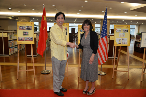 After the book exchange ceremony, Mr. Chu showed the exchange books’ area which placed the books donated from Indianapolis Public Library. The First Lady was very glad to see books from her country. She even asked her daughter to take a photo for her in front of the book shelf with Mr. Chu.