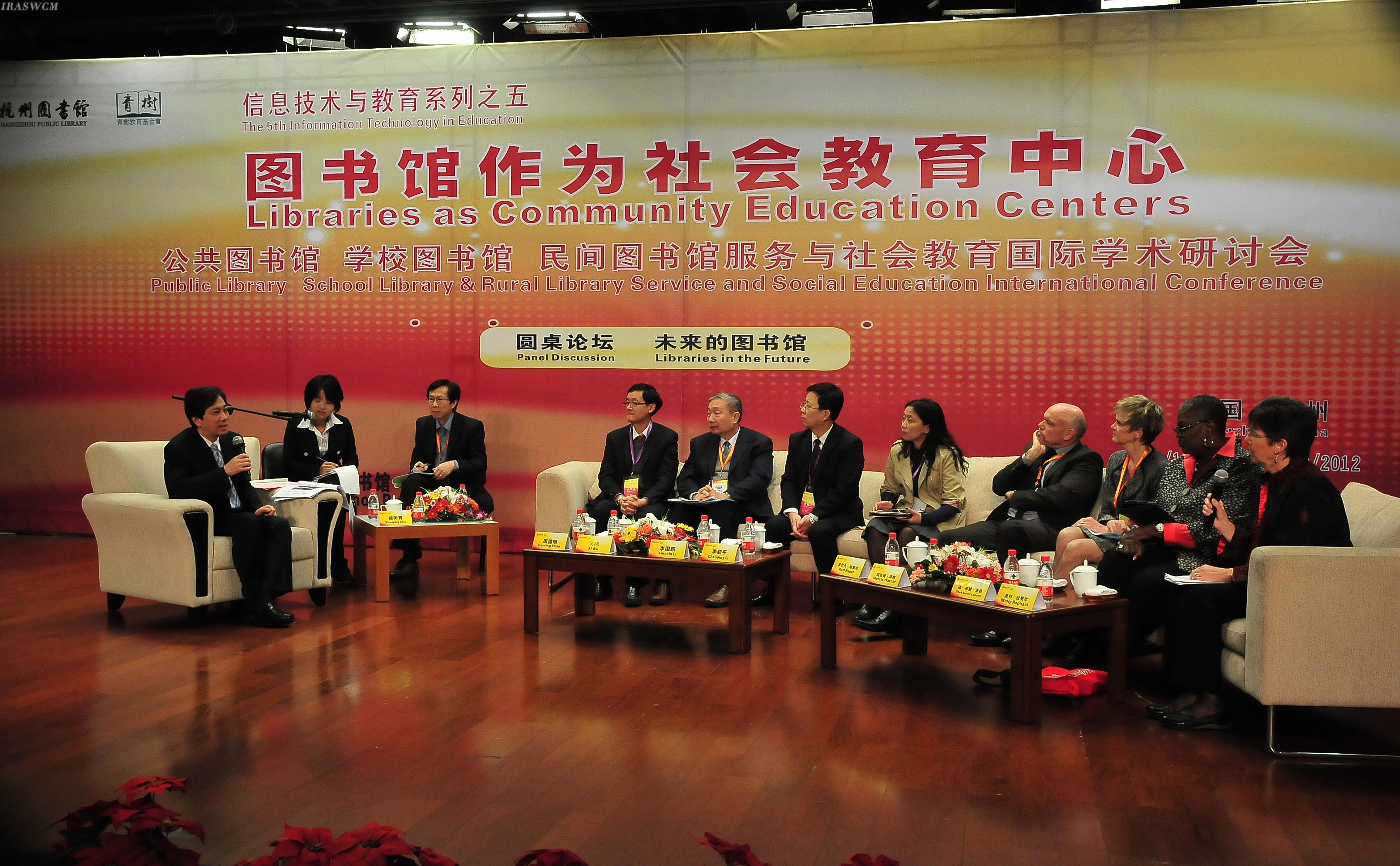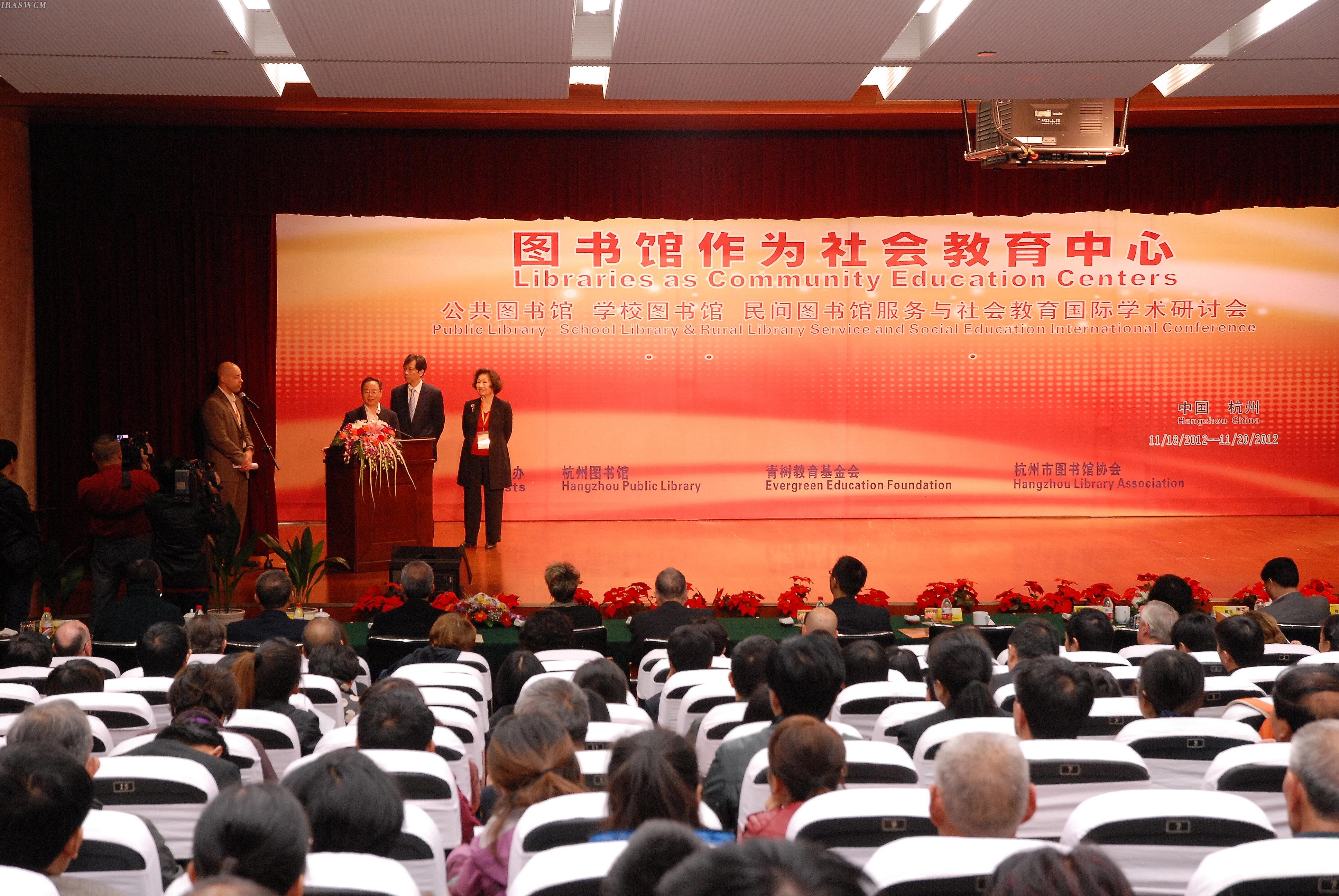 On morning of 19th November 2012, it was bright autumn day with gentle breeze in Hangzhou City. “The International Academic Symposium for Services of the Public Library, School Library, Non-governmental Library and Social Education” jointly held by Hangzhou Public Library and USA Evergreen Education Foundation was solemnly opened at the lecture hall of Hangzhou Public Library.