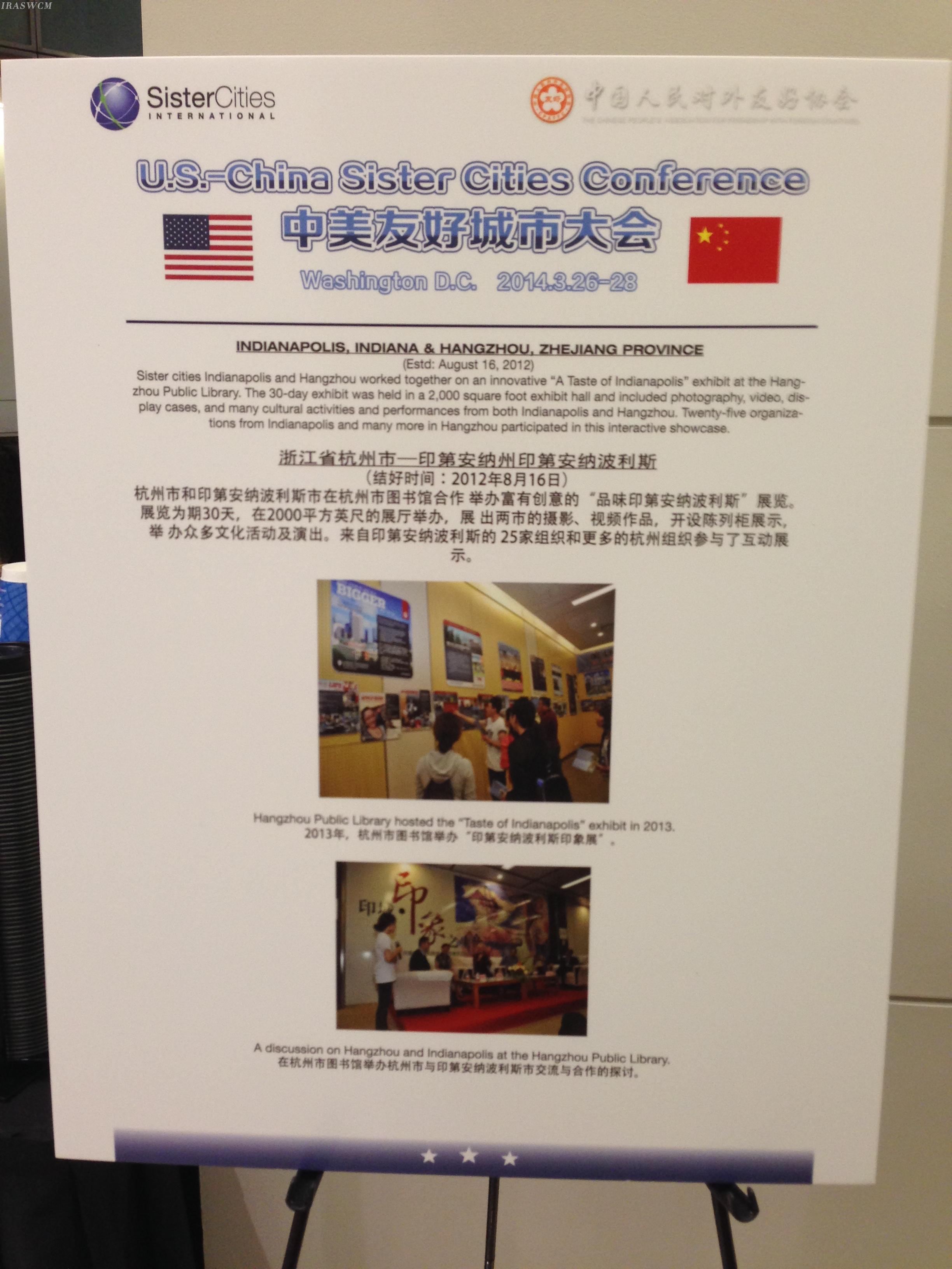 In recent period, at “Sino-US Sister Cities Conference 2014” held in Washington, USA, “Indianapolis Impression Exhibition 2013” jointly sponsored by Hangzhou Public Library and USA Indianapolis-Hangzhou Sister City Association won the best innovation prize. Chu Shuqing (director of Hangzhou Public Library), was invited to attend the conference and participate in the prize granting ceremony.