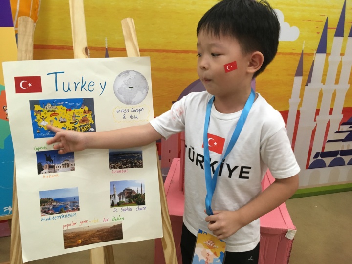 English is the "official language" in the carnival. Timmy, the 5 years old kindergartener was the little ambassador at the Turkey booth. Confident and diligent, he was busy with his work on providing basic understanding of Turkey and quizzing the kids coming to his booth. He prepared the props and scripts for several days with his mother who thought it's a good chance to broaden the mind as well as practice English.
