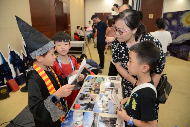 15 country-themed booths representing Germany, Brazil, the US, Canada, the UK, France, Netherland, Turkey, Egypt, Iraq, Malaysia, Japan, Australia, Russia, China were standing at the Hangzhou Public Library on August 31, attracting 120 local families, parents with kids, to participate in. Each booth has a test, pass it can obtain a stamp, and collecting all 15 stamps can exchange for a reward.