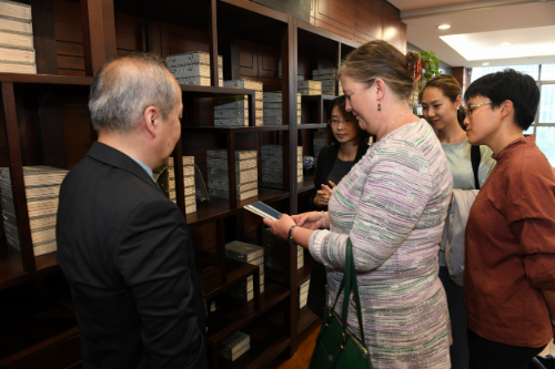 During the tour around the library, the guests were deeply impressed by the very accessible library service, Hifi room in the music branch, those ancient books kept on 3rd floor and the book shelf representing Hangzhou Public Library’s partnerships built with overseas libraries. Ms. Wendy Dorman-Smith said that 40,000 square meters of floor area, 7.3 million collections, and averagely 10,000 visitors per day are huge numbers to a country like Ireland which has a population of only 5 million. Behind these figures, she could see a warm and comfortable library.