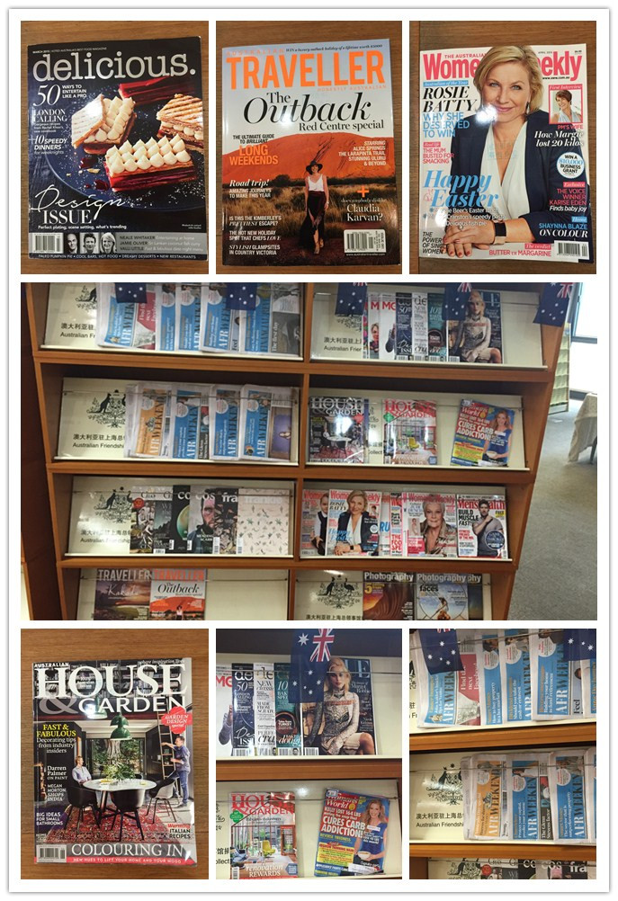 Hangzhou Public Library has established a special zone for the magazines and newspapers donated by Australian Consulate-General which renewed every month started from November 2014. Magazines such as House Garden, Australian Photography, Delicious andVogue Australia were warmly welcomed by readers.