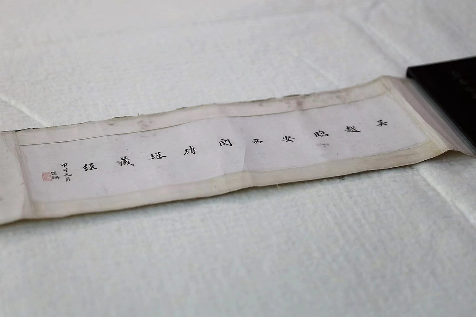 The Dharani Sutra kept in Hunan Library is from Hangzhou Leifeng Pagoda. In 1924, the Leifeng Pagoda which had fallen into disrepair, collapsed into ruins. The Dharani Sutra was discovered inside its perforated tower bricks. This rare scroll, which had been secretly hidden for a thousand years, was revealed.