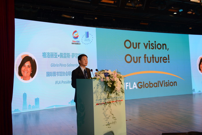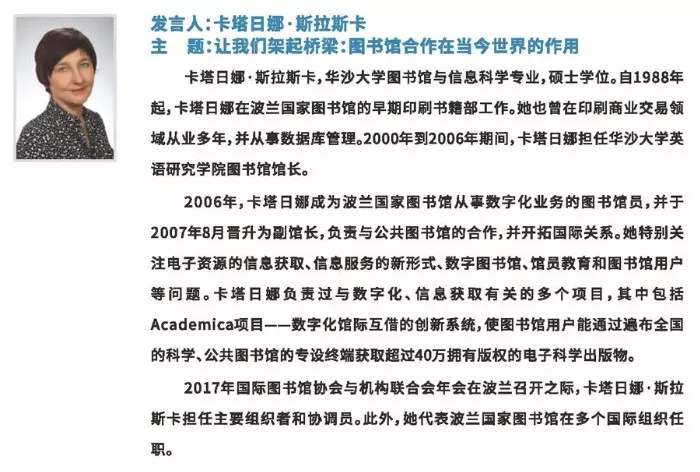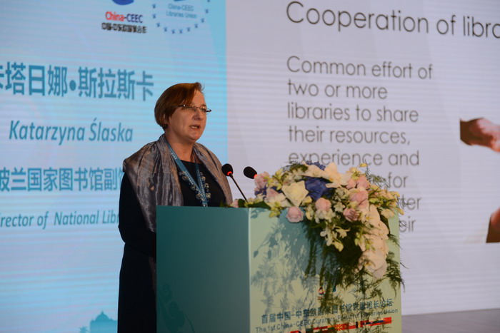 2018年10月20日下午,中国-中东欧国家图书馆联盟馆长论坛举行主旨发言,主题为:图书馆——合作、互联、共享。主旨演讲人分别是:国际图联主席格洛丽亚•佩雷斯•萨尔梅隆、中国图书馆学会副理事长刘小琴、波兰国家图书馆副馆长卡塔日娜•斯拉斯卡。